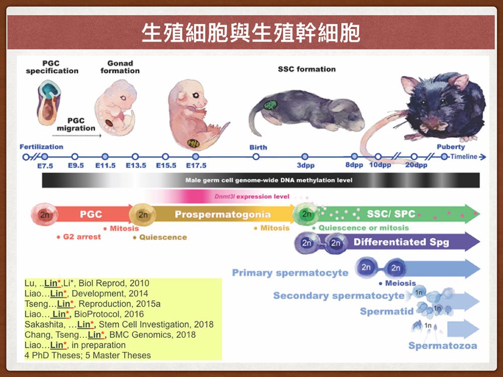 由於添加或移除表觀基因體修飾標記之酵素基本上存在於每個細胞內,關鍵問題在於因應微環境之變化,如何(how)由特定分子(what)於特定時機(when)帶領此等酵素至特定基因區位(where)添加或移除特定標記(which marks),以完成細胞功能。臺大生物資源暨農學院生物科技所林劭品教授即以雞、豬、小鼠與人類之生殖細胞與幹細胞為材料,研究細胞分化與複製動物再程序化過程中,影響基因表現與細胞命運決定之表觀基因體(Epigenomics)調控機制。於學術、技術層面之突破與應用包含:(一)解析表觀基因體調節蛋白(如不具酵素功能的類3號DNA甲基化酶)、長短鏈功能性非編碼RNA(non-coding RNAs)引導表觀基因體修飾,調控分化與發育相關基因,及內外源反轉錄病毒與跳躍基因/轉座子(Transposable Element)表現之新穎機制與作用途徑(The What, How, When and Which Marks; 與中研院陳俊安老師、交大洪瑞鴻老師,及臺、美、法合作研究:Nature, 2007,134:417-26; J. Virology, 2014, 88:10680-95; eLife, 2018, 7:e38080; BMC Genomics, 2018, 19:425)。(二)闡述與驗證生殖幹細胞休眠之多層次分子機制,了解男/雄性動物長期生殖能力維護之基礎,並揭示此一層次之不孕病因,且為季節性生殖之禽畜育種提供新方向(與中研院蕭百忍老師、臺大醫院何弘能院長、北醫大黃彥華主任、慈濟大學靖永皓老師及台、日、美合作研究:Development, 2014, 141:2402-13; Reproduction, 2015, 150:R77-91; Bio-Protocol, 2016, 6: iss 24; Stem Cell Investigation, 2018, 5:11)。(三)解析人類、豬、雞與小鼠胚幹細胞/誘導型多潛能幹細胞(induced pluripotent stem cell, iPS cells)、生殖細胞、骨髓間葉幹細胞於休眠、自我複製、分化等細胞命運決定相關調控之新穎機制,並發現有效篩選胚幹細胞株之分子標記(MEG3 LncRNA表現及IGDMR甲基化),可大舉提昇幹細胞往神經系統分化之效率及臨床試驗預防癌化之安全性(與臺大基因體與蛋白體醫學研究所陳信孚所長、臺大醫院何弘能院長、中研院郭紘志老師、臺大動科系鄭登貴老師、丁詩同主任、吳信志老師、劉逸軒老師、馬偕醫院李勝祥研究員、胡玉銘主任、李國光主任、林明輝主任合作研究:Stem Cell Research & Therapy, 2015, 6:1; Journal of Biological Chemistry. 2012, 287:14389-401; Journal of Animal Science. 2011, 89(11):3460-72; Biology of Reproduction. 2011, 84:514-25; PLoS One. 2017;12, e0184111; BMC Genomics. 2018; 19:425)。(四)與臺大生技所宋麗英老師及臺、法、美之多邊合作研究,以與桃莉羊相同之複製動物技術(somatic cell nuclear transfer)研究表觀基因體之可逆性,發現體細胞中H3K9me3抑制型表觀修飾為複製動物成功率低之重要原因之一,並建立受精卵發育早期內源性反轉錄病毒表現與胚胎發育成功率相關性之連結(Reproduction, 2015, 150:245-56)。(五)此外,於雞隻皮膚分化計劃執行過程,建立並優化由新鮮組織分離之少量細胞為起始樣品,進行染色質免疫沈澱-DNA定序(Chromatin -Immunoprecipitation-Sequencing)之方法學,並成功應用到校內多個研究室(與美國南加大鍾正明院士、臺大動科系林恩仲老師、臺大資工系歐陽彥正老師、臺大生機系陳倩瑜老師合作:BMC Genomics. 2015, 16:22)。(六)且與臺大生機系盧彥文教授共同研發Lab-on-a-chip平台應用在DNA甲基化分析(Lab on a Chip.18:514-521),提供農業及生醫領域現場應用之優勢。