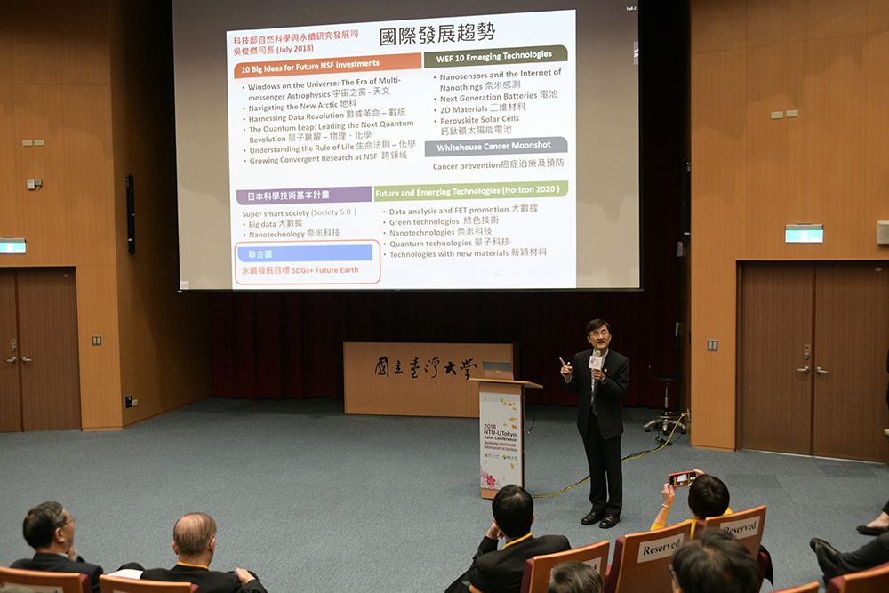 2018 NTU-UTokyo Joint Conference於12月12日由本校林達德副校長及東大五神真校長揭開序幕,郭大維代理校長雖未能親自出席,亦以影片致意歡迎。林副校長歡迎致詞中講述自2015年首屆雙邊論壇起,已連結超過300位兩校師生組成社群,本校亦於2016年啟動重點姊妹校初始經費計畫,補助有意與六所重點姊妹校合作研究之教師,迄今已補助162件合作研究案,其中與東大合作案共計56件,成果豐碩。