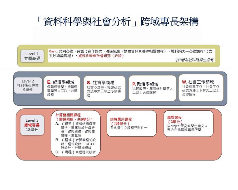 基此,本跨域專長針對社會科學院現有的課程進行跨系所整合,並將課程架構共分三個層級。