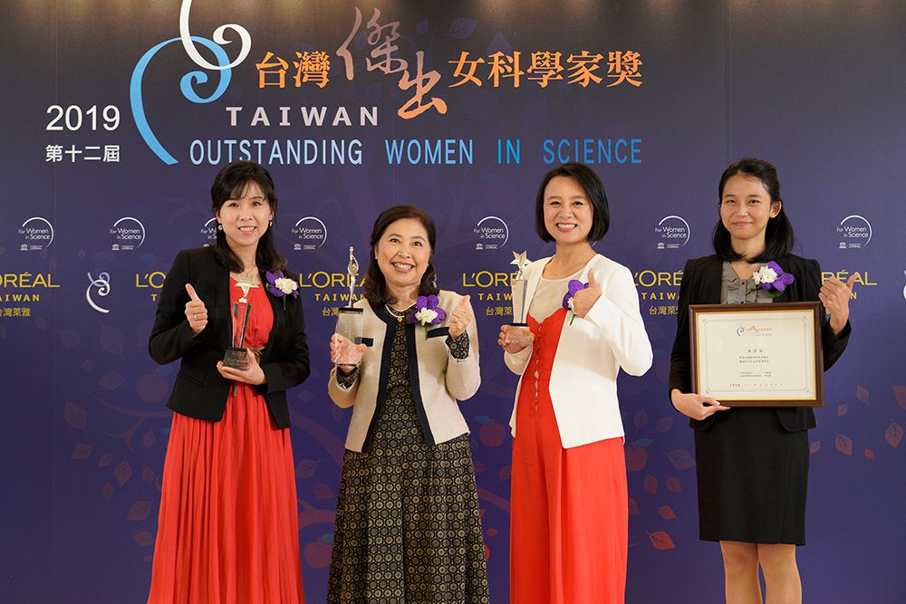 「第12屆台灣傑出女科學家獎」得主合影(由左至右):新秀獎得主周苡嘉博士、傑出獎得主李瑩英博士、新秀獎得主任昊佳博士、孟粹珠獎學金得主陳香穎同學