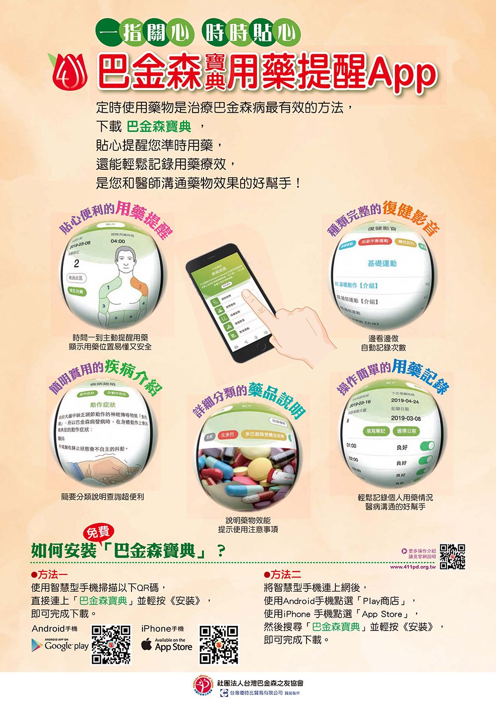為此,臺大醫院巴金森中心與臺灣巴金森之友協會在善心企業贊助下,共同為巴金森病友開發了一款手機APP,協助解決病友的服藥問題,同時也附帶提供許多對病友十分實用的貼心功能。
