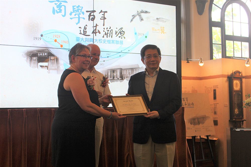 展覽開幕上還有一對遠從荷蘭過來的訪賓- Pheifer 夫婦(Thomas and Ellen Pheifer),Pheifer 夫婦其長輩為日治時期臺北高等商業學校荷蘭語教師,夫婦於2018年與臺大校史館聯繫,並決定於今日將其母親在臺灣生活所蒐集的相簿捐贈給國立臺灣大學,成為本校臺灣資料與校史資料的典藏,本校為表感謝,管校長特別致贈感謝函給Pheifer 夫婦。
