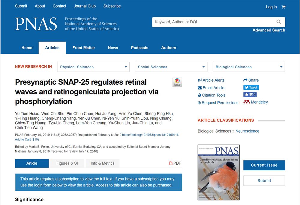 我們能夠看到這繽紛美麗的世界完全倚靠視覺,視覺成像始於眼睛內的視網膜細胞;眼睛是靈魂之窗,透過眼睛我們才能在看到照片時勾起許多美好的回憶;所以一旦失去視覺,人生便會失去許多的光彩;但如此精密的視覺網路是如何形成的? 已知視覺系統在發育時期,有一種『視網膜波』,以一分鐘一次的速率橫掃數百個視網膜細胞,並傳播至整個大腦視丘及視覺皮質。因為一起有同步視網膜波的神經元會連接至同一處,使左右雙眼的視神經得以投射到大腦視丘的不同區域,形成精準的視覺網路。然而,迄今未明的是,視網膜細胞中是否存在某種特定的分子,可以調控視網膜波及視覺網路的形成? 生命科學院分子細胞所王致恬老師團隊與長庚大學盧主欽老師團隊一起合作,發現一種新的調控視覺網路發育的分子機制,此項研究已發表在美國國家科學院院刊(PNAS; 參考網站: https://www.pnas.org/content/116/8/3262.long);主要敘述在發育中視網膜特定的神經元內,存在一種調控神經傳導的分子(SNAP-25b),其上特定的胺基酸(T138)被蛋白激酶A磷酸化後,可抑制神經傳導的強度和視網膜波的時空性質,而這些變化足以進一步引起全面的效應,改變視網膜連結至大腦中樞的視覺網路。