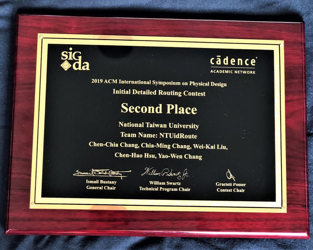 臺大電機系與電子研究所於電子設計自動化最重要的國際研發競賽再度獲得佳績!今年於美國加州舊金山市 (San Francisco) 舉辦的「國際積體電路實體設計會議」 (ACM International Symposium on Physical Design, ISPD) 公布為期四個多月的「ISPD初始細部繞線研發競賽」(ISPD Initial Detailed Routing Contest)最終結果,由臺大電機系與電子所張耀文教授和電機系大四學生張家銘、張振嘉、劉維凱以及電子所碩士生徐晨皓所共同研發的初始細部繞線器NTUidRoute獲得了第二名的榮耀!