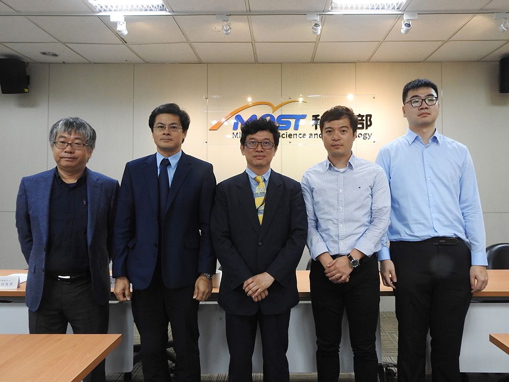合影(左起):科技部自然司林敏聰司長、國家同步輻射中心陳俊榮副主任、科技部謝達斌次長、本校化學系 陳浩銘教授、化學系許家碩博士生