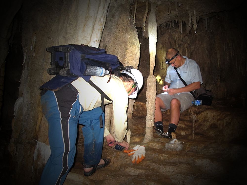臺大地質系沈川洲教授與施路易教授 Dr Ludvig Löwemark 在泰國南部可蘭洞進行洞穴觀測計畫 分析溫度與濕度以及採集洞穴滴水