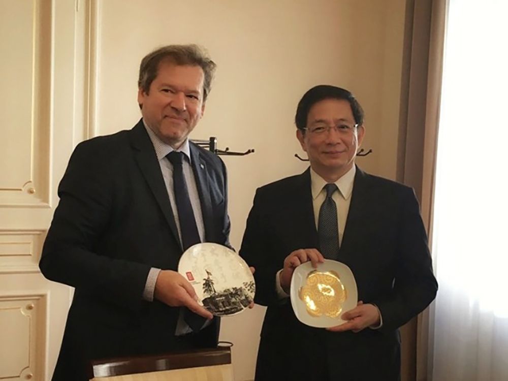 管校長與盧比安納大學校長Prof. Igor Papič交換學校紀念品。