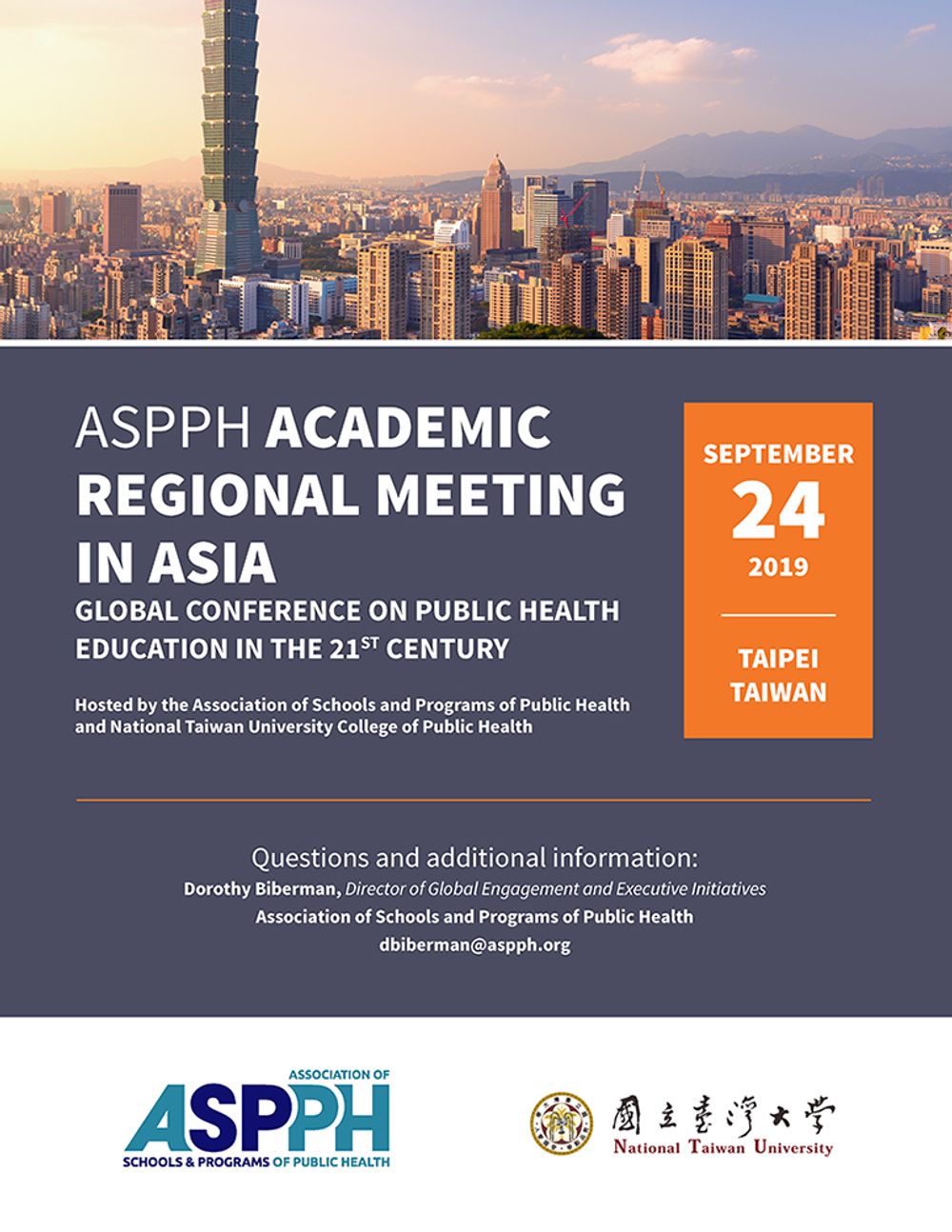 為了提升全球公共衛生的教育品質,ASPPH與公共衛生學院於本(2019)年9月24日共同舉辦「ASPPH亞洲學術區域會議」,主題為:21世紀公共衛生教育的全球會議(2019 ASPPH Academic Regional Meeting in Asia: Global Conference on Public Health Education in the 21st Century)。會議地點在臺大公衛學院大樓。有美國、日本、韓國、義大利、香港、澳洲、孟加拉、斯里蘭卡、尼泊爾、格瑞那達、印度、印尼、馬來西亞、泰國、越南等15個國家共63位公共衛生學界的領袖前來臺灣參加本次會議,和國內300位公共衛生學者專家一同討論公共衛生教育的未來。