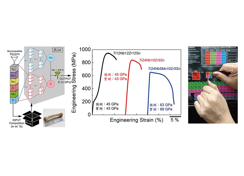 本校材料科學與工程學系顏鴻威副教授及其研究生吳俊德嘗試以類神經網絡法建立機器學習技術,該機器學習法能大範圍預測富鈦複雜合金之結構與楊氏係數,成為材料研發之高速探索引擎,並經由將近2年的實驗驗證,證實其機器模型之預測能力將近70%,將該機器命名為βLow - It finds β Ti alloys with very low modulus。融合冶金理論的βLow設計非常簡單卻巧妙,而研究團隊於βLow機器所預測的合金成分中,成功與中鋼公司共同發展出Ti-12Nb-12Zr-12Sn(in wt. %)合金,稱為Ti-12合金。Ti-12之楊氏係數僅僅只有43 GPa,與鎂合金相當,此外,該合金擁有相當優異的生物相容性並利於骨細胞成長,Ti-12不但密度低故兼備輕量化之特性,它的抗拉強度接近900 MPa,相當於先進超高強度鋼等級,更難得的是Ti-12合金成本相較於各國專利發明皆較低,為一種新型態人工髖骨替代材。