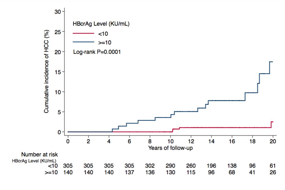 本團隊早年設立2666位慢性B肝患者之世代,已持續在臺大醫院追蹤15年以上。我們對納入研究時的血清檢體進行核心相關抗原檢測,同時搭配B肝病毒量進行分析,發現核心相關抗原濃度和肝癌發生有顯著正相關,而在病毒量兩千到兩萬單位之中病毒量患者,若核心相關抗原大於ㄧ萬單位,日後發生肝癌風險遠高於核心相關抗原小於ㄧ萬單位的患者(圖一)。此外更發現低核心抗原的中病毒量患者,其肝癌風險趨近於不活動B肝帶原者,而高核心相關抗原的中病毒量患者,其肝癌風險相當於高病毒量患者。