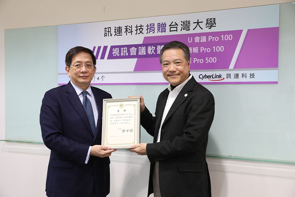 感謝訊連科技捐贈「U 會議」及「U簡報」視訊會議與教學直播服務,協助臺大加強建構遠距教學和即時討論之平台。訊連科技創辦人黃肇雄博士,是本校電機系畢業的傑出校友,於UCLA 加州大學洛杉磯分校獲得博士學位後,回到臺大資工系任教,並創辦了臺大多媒體及傳播實驗室。