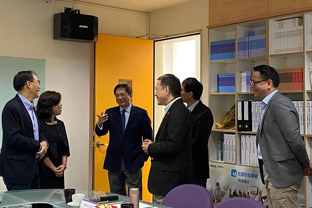 校園防疫專案捐贈儀式,自左至右為袁孝維國際長,管中閔校長,訊連黃肇雄創辦人和丁詩同教務長。