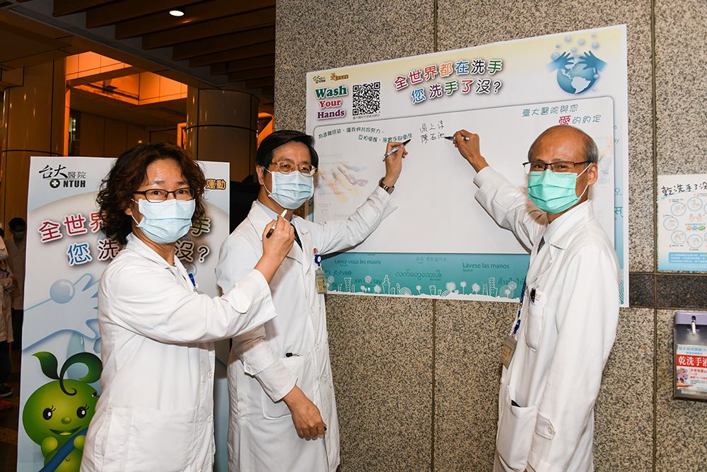 臺大醫院世界手部衛生日-陳石池院長及張上淳副校長、感染管制中心陳宜君主任簽名響應活動