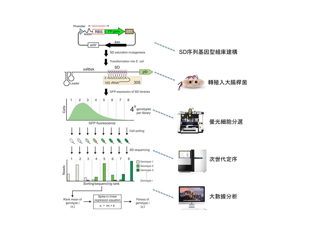 為了揭開基因型-表型關聯的全貌,生科系周信宏老師 (圖一,右三) 發展一套結合螢光細胞分選及次世代定序技術的高通量實驗平台 (圖二),能同時建構百萬種基因型,並觀測每個基因型產生的表型,他以細菌的 SD (Shine-Dalgarno) 序列作為研究題材。SD序列為基因上游9個鹼基構成的區塊,SD序列影響核糖體的附著並決定基因的蛋白轉譯速率,教科書將SD定義為一段富含 A、G鹼基的序列,但自然界SD序列的基因型其實很多元。周老師以高通量技術在四種大腸桿菌基因的上游產生所有種類 (4^9) 的SD基因型,並觀測每個基因型的表型 (轉譯速率)。他發現四種基因上游對SD功能的影響各有不同,增加了SD基因型-表型關聯的複雜性,但透過大數據分析周老師從看似雜亂的表象中找到簡單的規則 (圖三左):G鹼基越多 (G-more) 的SD基因型通常具較高的轉譯速率,反之,A鹼基的多寡則與轉譯速率無關。生細所溫進德老師 (圖一,左一) 進行單分子實驗並驗證了這項觀察,實驗結果顯示G鹼基提高SD序列與核糖體的親和力,進而增加蛋白轉譯速率。G-more法則簡化了人工SD序列的設計,使合成生物學家可更精準的預測並控制基因表現。