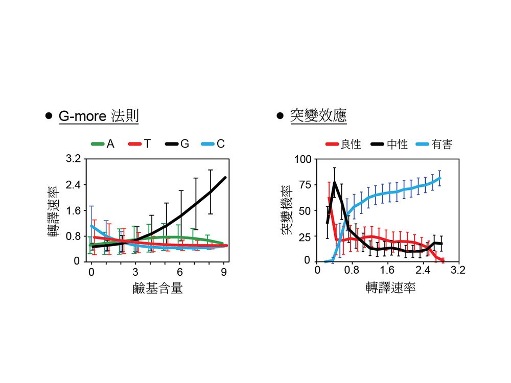 另一方面,周老師從演化及遺傳學的角度分析SD基因型-表型關聯的特性,他發現轉譯速率越低的SD基因型獲得良性突變的機率越高,令人意外的是,SD序列在朝向高轉譯速率的基因型演化的過程中,獲得良性突變的機率仍維持一穩定值(圖三右),此現象與演化理論的預測相左。上述兩種特性都可增進SD序列的演化潛力 (Evolvability),至於兩特性是否為生物系統所共有則有待後續研究進一步探討。