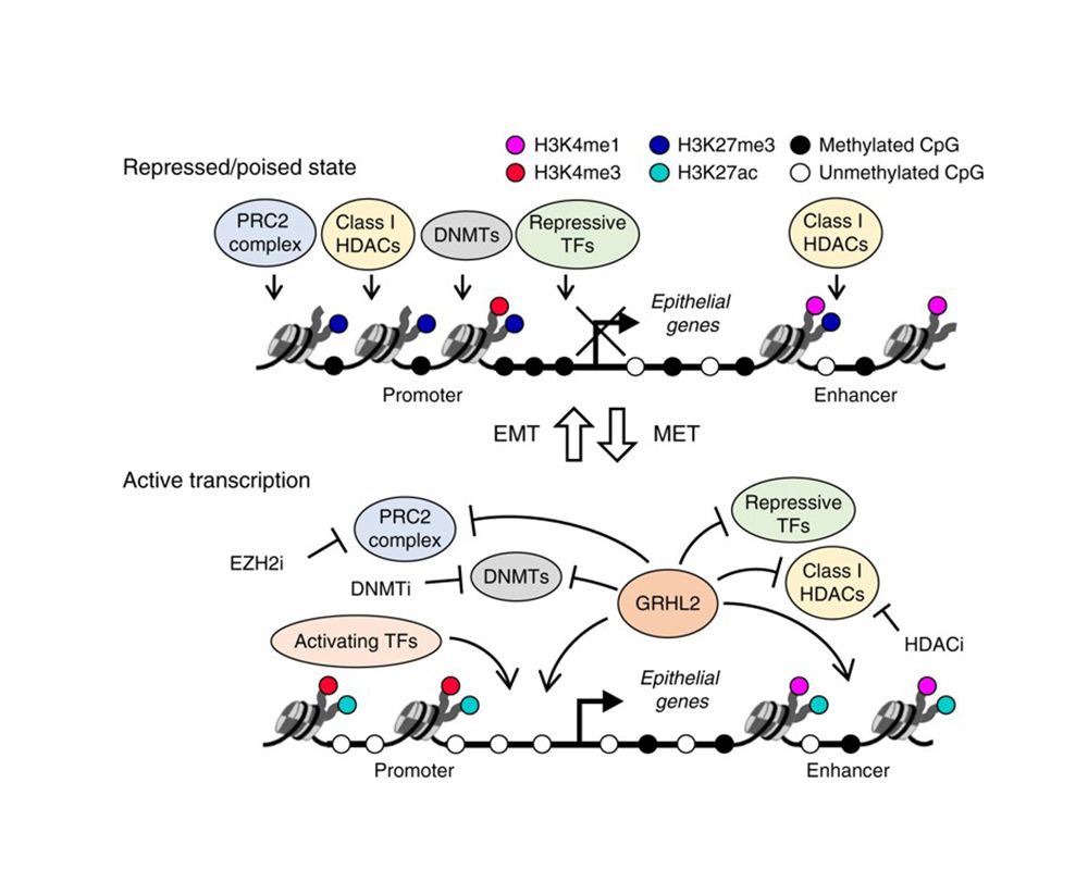 A schematic model illustrating the epigenetic regulation of epithelial genes in the repressed poised or active state during EMT and MET involving intermediate phenotype changes.