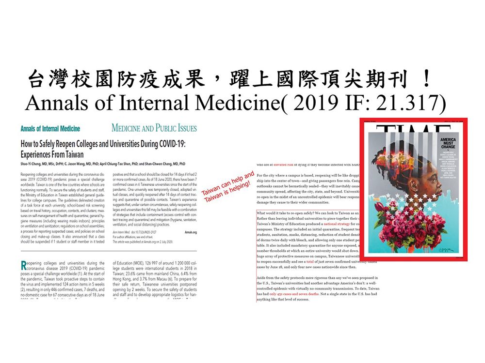 由臺灣大學學務處保健中心主任程劭儀副教授、副校長張上淳教授、學務長沈瓊桃教授、以及史丹佛大學醫學院王智弘(C. Jason Wang)副教授等人共同撰寫的臺灣校園防疫經驗文章,榮登國際頂尖醫學期刊:內科學年刊( Annals of Internal Medicine)