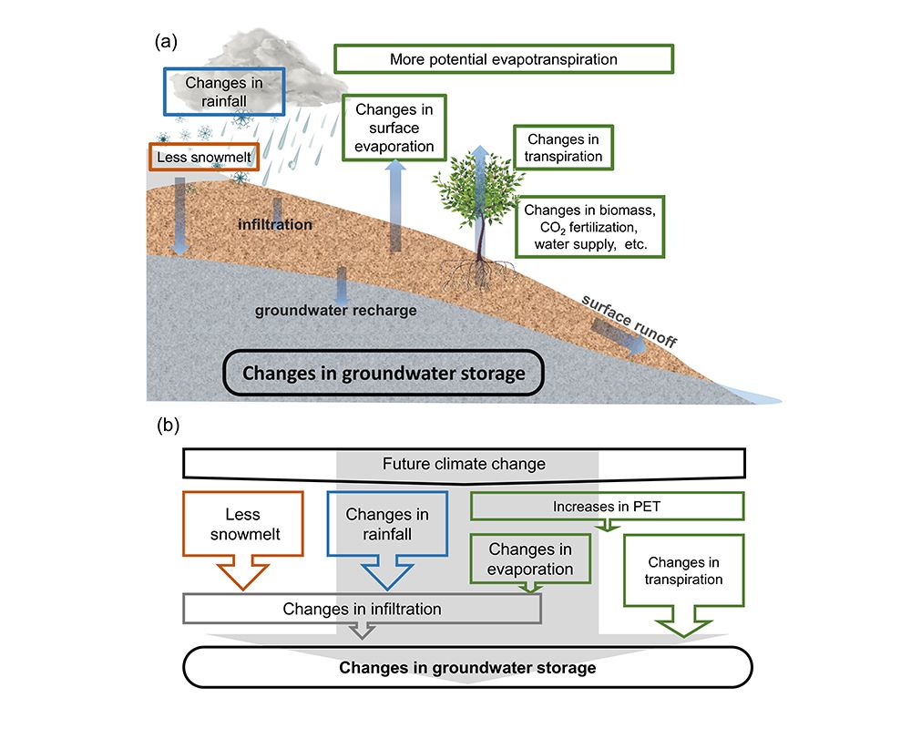 評估氣候變遷對於陸地水循環的影響一直是世界各國的重點研究。最新研究顯示氣候變遷造成的地下水位變化不僅受到降雨變化影響,蒸發散量以及融雪量的影響程度也不能忽視。未來一百年各地區的地下水趨勢取決於全球暖化下的水循環變化,然而每個地區主要改變的水循環因子各不相同,在濕潤區域,降雨是重要的因子,乾旱地區則是蒸發散,高緯度及高山地區則仰賴融雪的補注。研究同時發現,即使在某些區域氣候變遷造成的降雨增加可補充地下水,但在人為地表變遷與農業發展導致地下水抽取頻繁的地區,抽取量遠超過於自然補注量,因此未來水資源的調配將會面臨巨大考驗。
