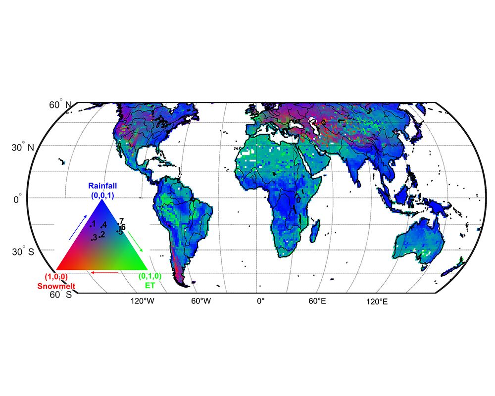 氣候模式在未來暖化下所模擬全球地下水的收支可歸因於三個氣候驅動因素:降雨、融雪與蒸發散量。三角形中的紅、綠與藍色階數值代表每個因素的相對貢獻:紅色表示融雪的貢獻量、綠色表示蒸發散的貢獻量以及藍色表示降雨的貢獻量。