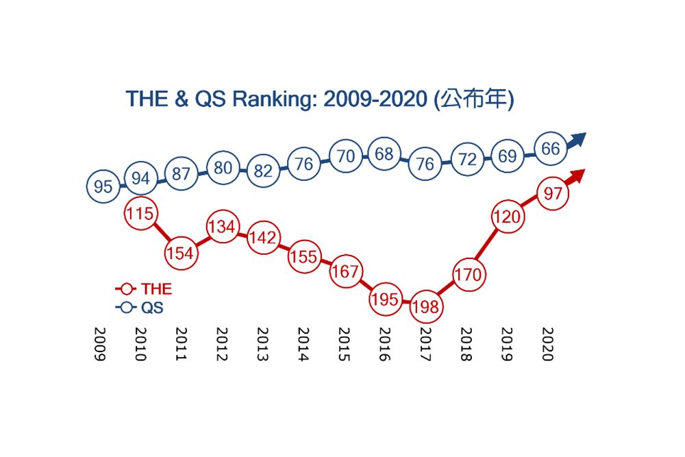臺灣大學全體師生同仁長期以來在上述各個面向的努力持續不懈,且日復一日自我鞭策向上向前,動力來自內心的自發與世界名校夥伴的激勵。本校自2009年起在英國國際高教評比公司(Quacquarelli Symonds, QS)之排名首次進入百大(當年為95名),11年來不僅一直保持在百名內,更是逐年上升,今年更於六月榮獲最佳的66名肯定。另外,根據9月2日最新公布的英國泰晤士高等教育(Times Higher Education, THE) 對2021年全球高教排名,臺灣大學也榮獲全球大學排名97名,這是本校首次進入THE獨立評比百大排名,更較去年第120名進步了23名,不僅是所有臺大人努力的成果,這也是國際高等教育評比機構對本校辦學的肯定。今年「雙入百大」的成績將鞭策臺大繼續努力,永不停歇向著世界名校標竿追求卓越。