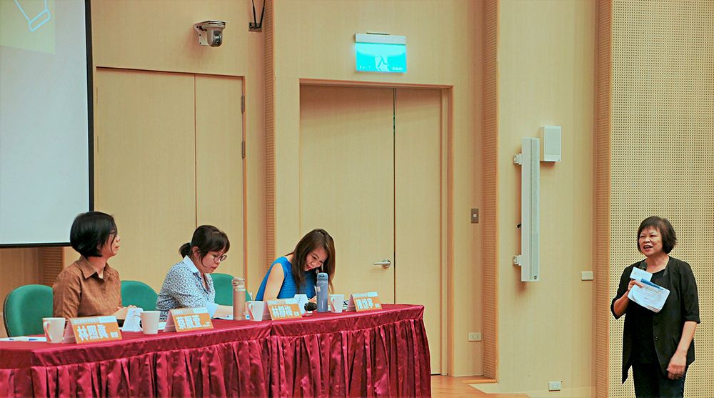 第三場次講者合照,左起蔡靚萱、林靜梅、陳憶寧;最右為主持人林照真。