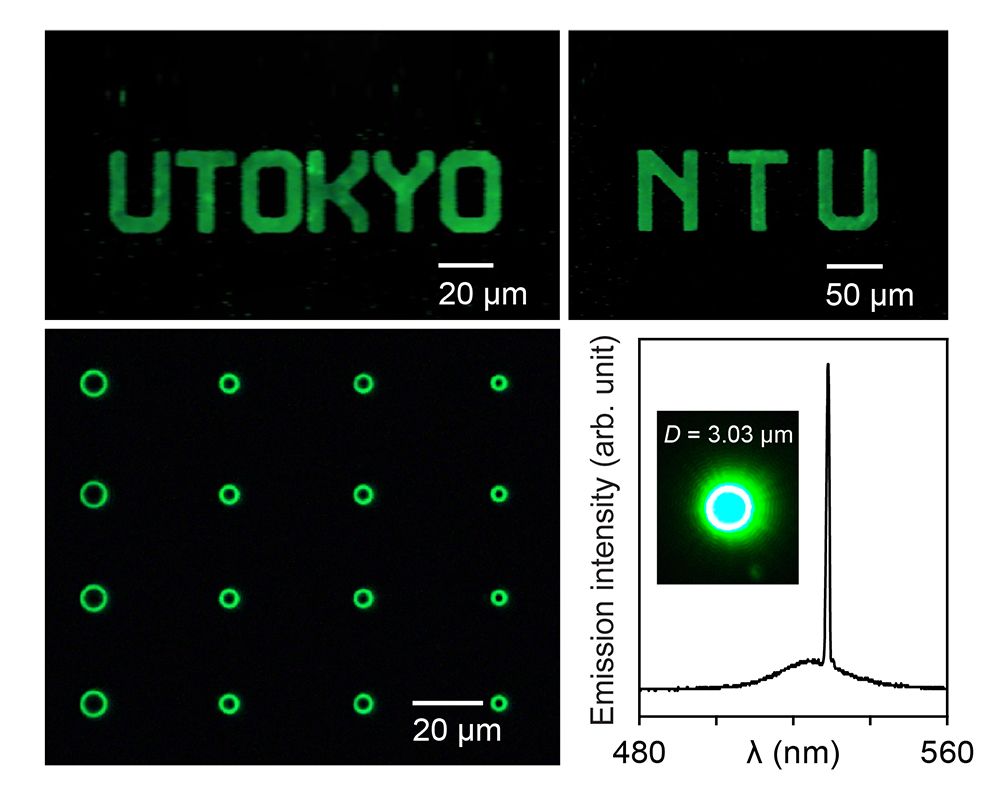 此外,鈣鈦礦材料亦有相當優異的發光特性與量子效率,具有相當高的潛力於高效能發光二極體與雷射的應用。然而目前遇到最大的瓶頸是鈣鈦礦材料的穩定度不夠好,一直無法利用半導體產業相當成熟之微影(lithography)製程技術,來製作高效能的雷射所需的共振腔。本次臺大與東京大學組成之跨國研究團隊,突破此製程技術的瓶頸。利用目前廣泛用之半導體微影製程技術,提出所謂「自我修復(self-healing)」的觀念。在微影製程中,利用材料能自我組裝(self-assembly)與再結晶(recrystallization)的特性,開發“Self-Healing Lithographic Patterning”的技術,大面積製作出高效率的單模雷射(single-mode laser)。此技術可以利用目前相當成熟的半導體微影製程技術,來製作大面積、高品質之鈣鈦礦光電元件,相當具有工業應用價值。其結果最近發表於材料領域著名期刊Advanced Functional Materials。圖示即為以此先進之微影技術,將鈣鈦礦材料製作成UTokyo與NTU 雙方校名,並刊登於期刊中。
