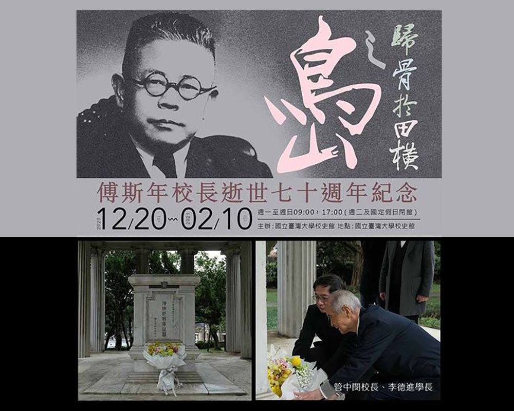 為紀念傅校長對臺大的貢獻,臺大校史館現正舉辦「歸骨於田橫之島:傅斯年校長逝世七十周年紀念」展覽,展期自即日起至2021年2月10日,歡迎大家前來參觀,共同緬懷傅校長的點點滴滴。