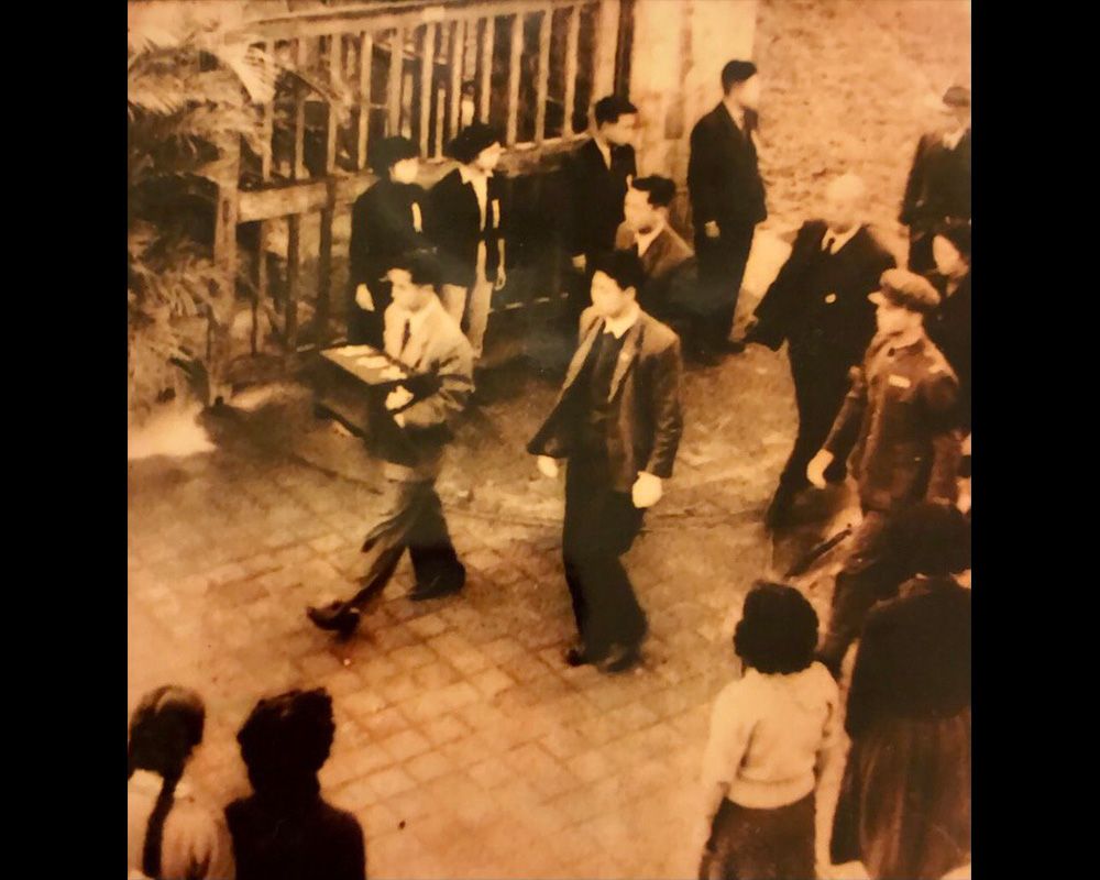 當年安葬典禮當天從傅斯年校長宿舍移靈路程的最後一段是當屆臺大代聯會主席李德進學長 (圖中左一) 捧骨灰盒進傅園。李學長左後方為前一屆代聯會主席羅錦堂。