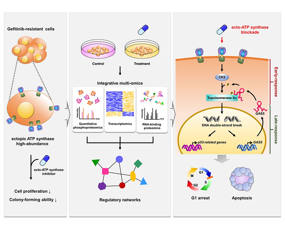 一、阮老師團隊運用各種體學,包括轉錄體學、磷酸化蛋白體學和RNA結合蛋白體學,並用多種生化和細胞實驗證明抑制肺癌細胞表面的ATP合成酶,會透過長鏈非編碼核醣核酸所調控的磷酸化訊息網路,誘導具抗藥性肺癌細胞的死亡。此成果發表於蛋白體學領域排名第一的《分子與細胞蛋白質組學期刊》(Molecular & Cellular Proteomics) (DOI: 10.1074/mcp.RA120.002219)。
