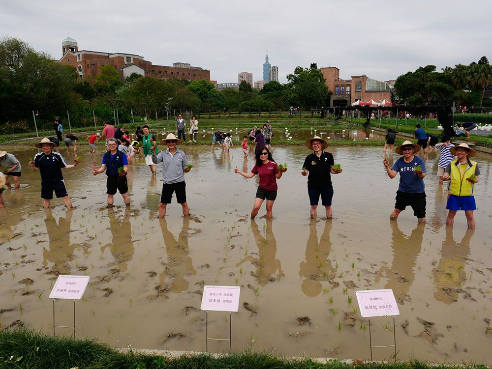 本次活動參與者皆頭戴斗笠,赤腳下田,體驗在寸土寸金台北市的田園插秧之樂。參與活動的捐款人表示,在台北市內插秧,親身體驗傳統農耕文化,體悟農民的辛勞,也感到舒壓與療癒,是非常難得的經驗。今天還有許多農藝系系友們回娘家,重溫大學時代腳踩泥土,親手插下秧苗的回憶。系友們笑談當年愛漂亮的學姊穿絲襪下田,還有同學的雨鞋困在泥巴裡差點摔跤的糗事。也有系友們帶著都市長大的孩子或孫子們體驗下田插秧,象徵著農藝系代代傳承,為臺灣與全世界的糧食安全及永續農業而持續努力。