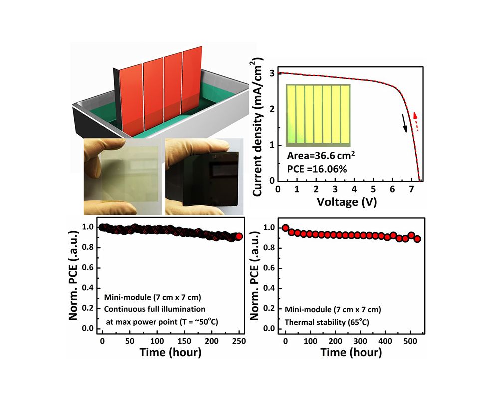 這項以本校為首的跨國研究,由王立義教授主導的研究團隊在鈣鈦礦前驅溶液內,引入一種常應用於純化天然氣的穩定性無色液體環丁碸(sulfolane)作為添加劑,藉由有效控制鈣鈦礦的結晶行為,大幅延長製程的可加工時間,提高加工的便利性與彈性,因此可應用於各類工業化製程。該團隊進一步利用常見的浸漬方法(dipping process),製造出大面積的高質量鈣鈦礦薄膜,成功展示兩種不同面積的高轉換效能電池模組,有效面積與電池效率分別為15.84 cm2 (17.58%) 和36.6 cm2 (16.06%)。更重要的,這些元件模組具有優異的操作穩定性,在恆溫(50oC)與恆定照明條件下持續工作250小時後,仍能保留約90%的初始光電轉換效能。對此,臺灣大學材料科學與工程研究所博士生,同時為本論文第一作者的黃信祥說明:「本工藝具有方法簡易、成本低廉、相容於現有製程的優勢」。Wanyi Nie與Hsinhan Tsai博士則指出:「本研究成果將可應用於製造低成本的大面積太陽能電池模組,並容易與工業產線結合」。