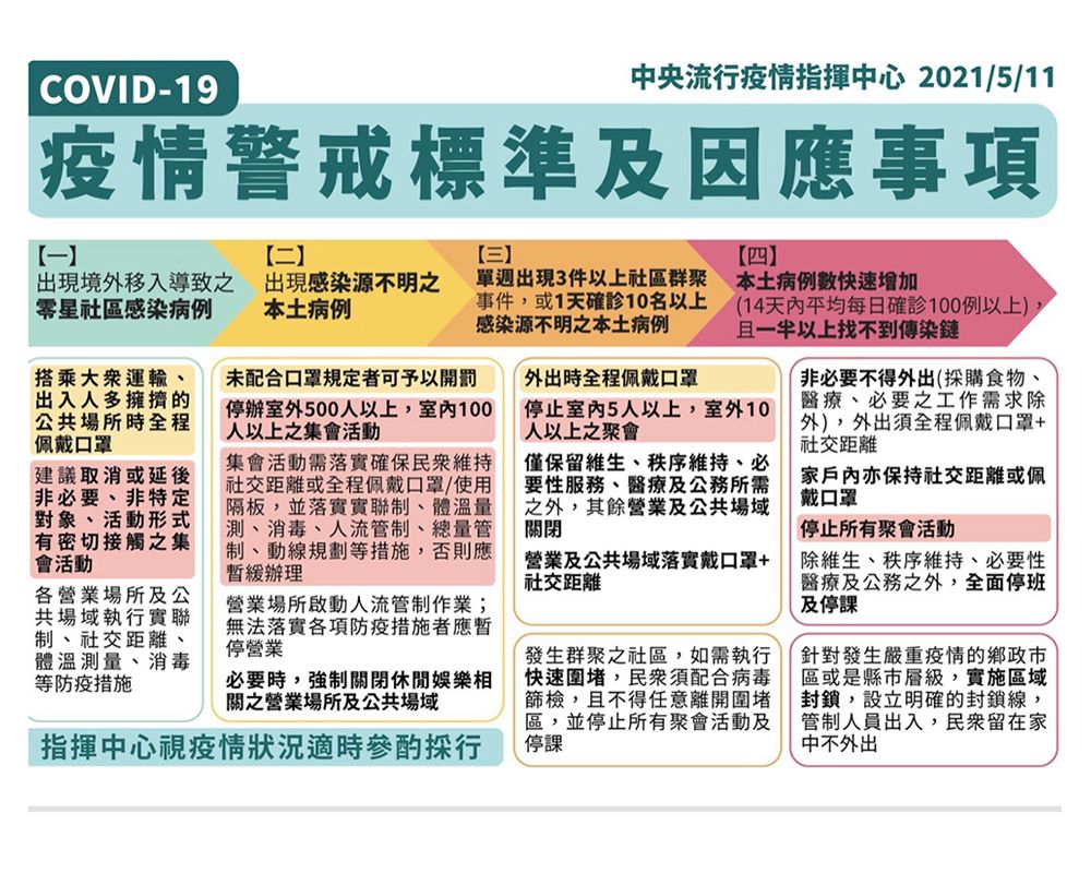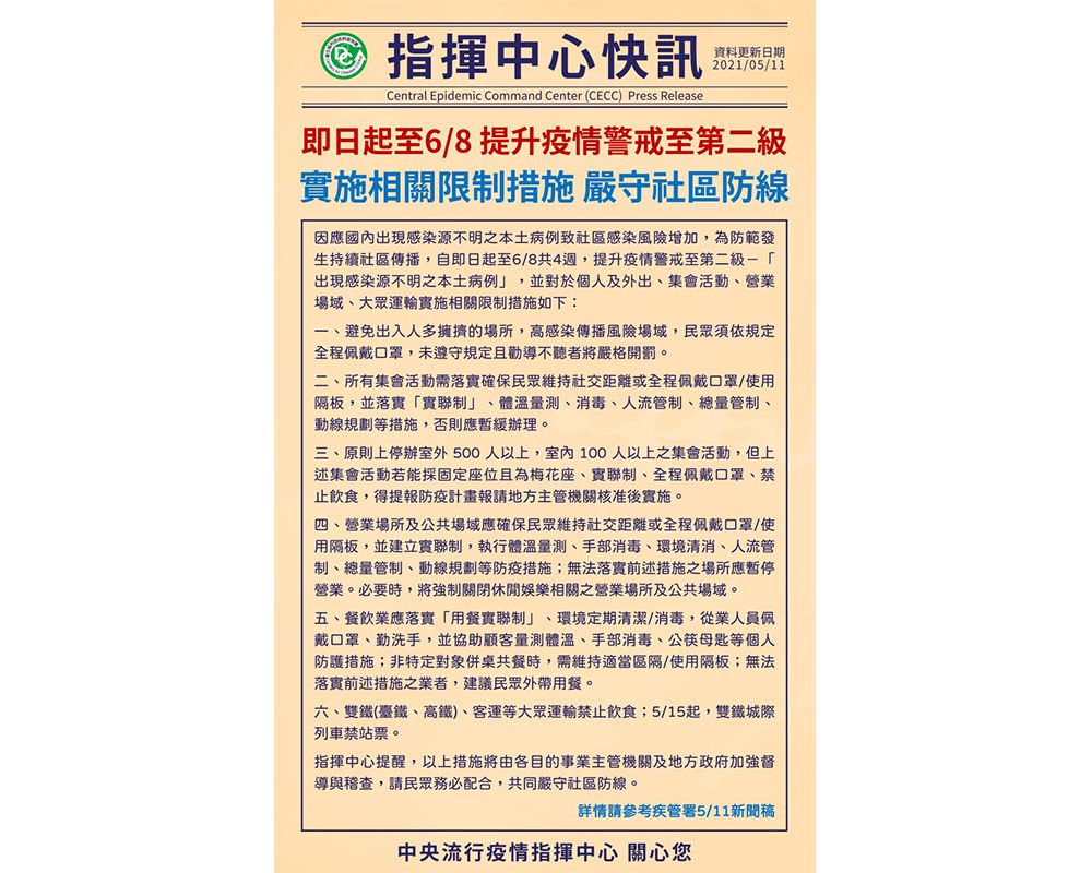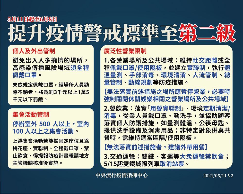 因應中央流行疫情指揮中心宣布即日起至6月8日共4週,疫情警戒標準進入第二階段防疫(黃燈),請本校各單位配合下列防疫措施: