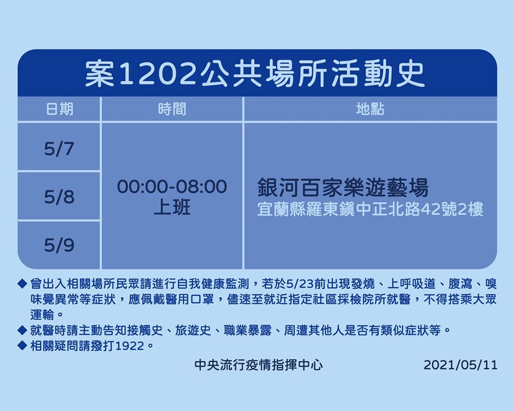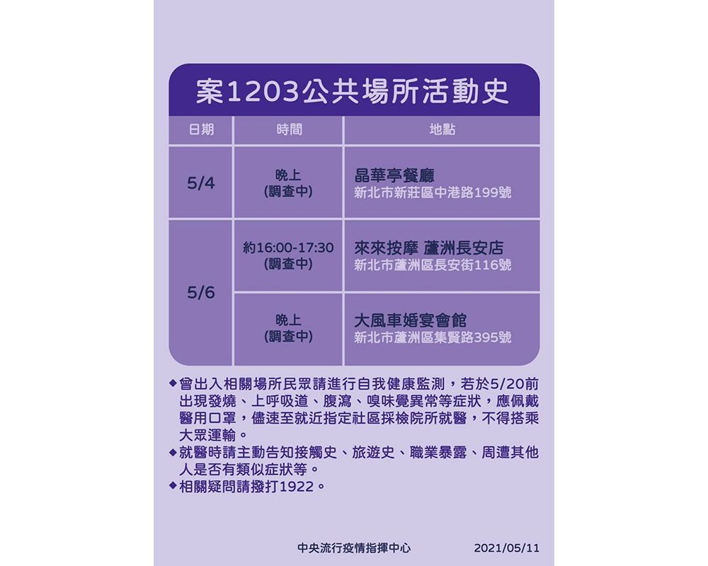 - 再次提醒,疫情期間請大家出門儘量配戴口罩、勤洗手、與他人保持社交距離,並自我注意是否出現發燒、呼吸道症狀、腹瀉、嗅味覺異常等疑似症狀。如出現疑似症狀,應確實配戴醫用口罩,儘速至附近社區採檢醫院就醫,且不得搭乘大眾交通運輸工具;就醫時,應主動告知接觸史、旅遊史、職業暴露及身邊是否出現其他人有類似症狀;返家後亦應佩戴醫用口罩,避免外出。