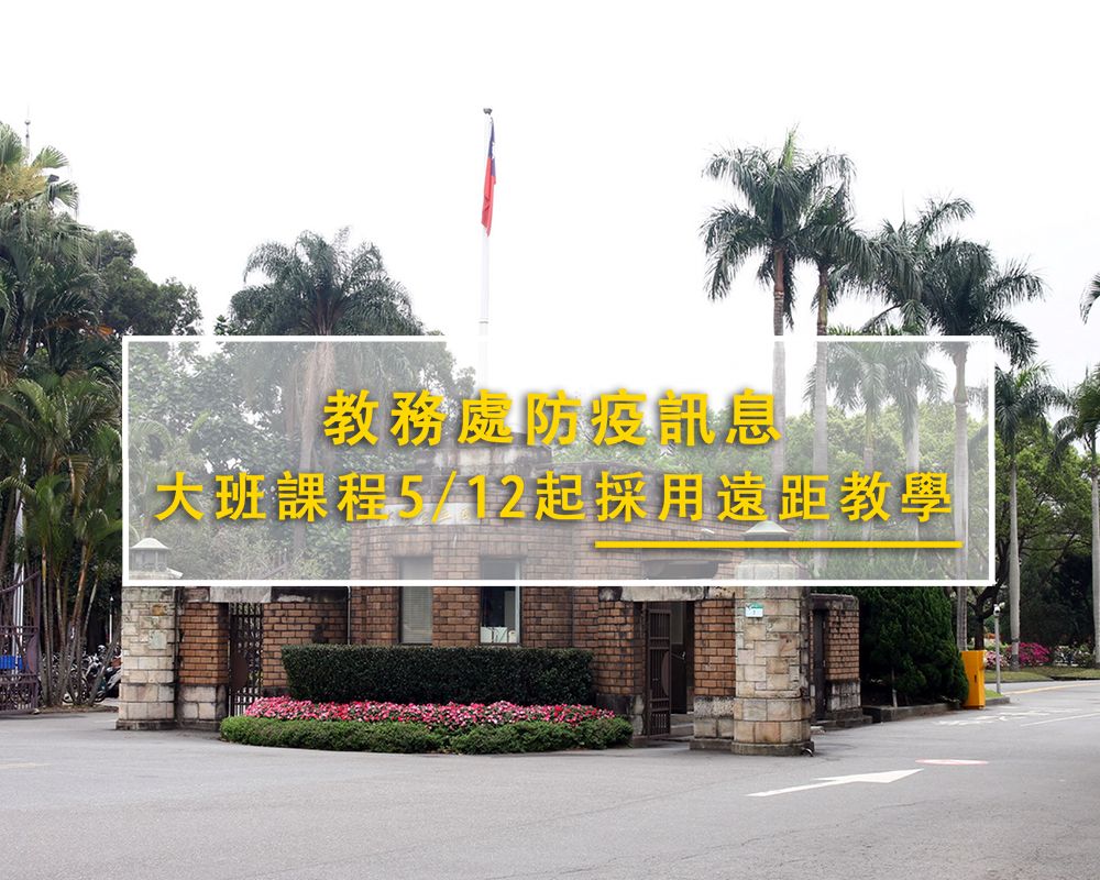 為因應嚴重特殊傳染性肺炎疫情的發展,本校修課學生人數達100人以上大型課程 (不含實驗/實習/實作課程),自5/12起請改採遠距教學,小班課程應保持室內1.5公尺的社交距離,全程配戴口罩,請所有老師包涵並配合辦理。