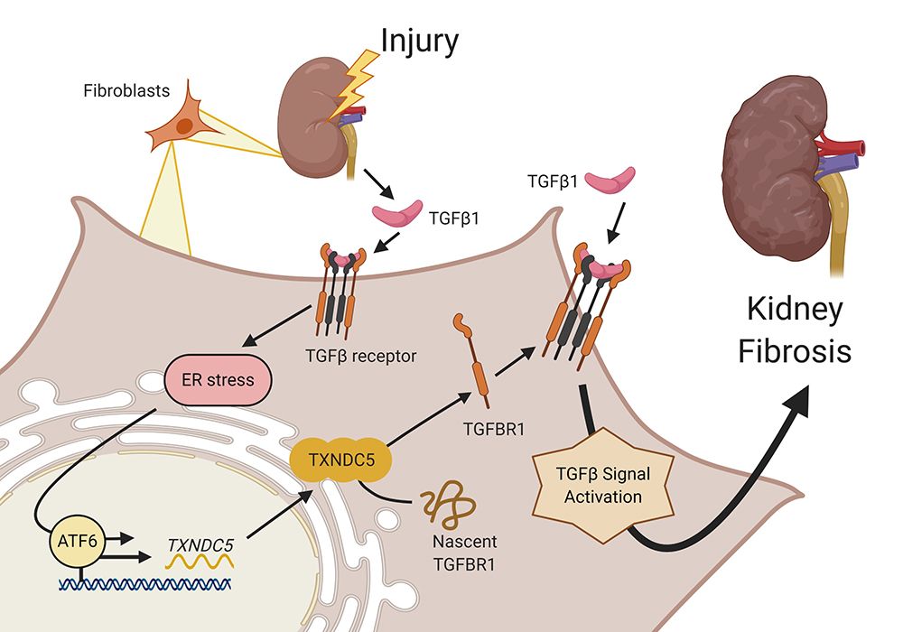 楊鎧鍵老師研究團隊過去分別在2018及2020年發現內質網蛋白Thioredoxin Domain Containing 5 (TXNDC5)在心臟(Shih YC and KC Yang, Circ Res 2018,122:1052-1068)及肺臟(Lee TH and KC Yang, Nat Commun 2020;11:4254)纖維化中扮演重要的角色。在纖維化的心臟及肺臟中TXNDC5都有高度的表現,若於小鼠中剔除(Knockout)TXNDC5可以有效地改善纖維化的情況。博士班學生陳彥廷延續過去的研究,發現TXNDC5高度表現於纖維化的腎臟當中,並主要分布在腎臟纖維母細胞內。透過細胞及動物實驗,研究團隊發現TXNDC5在腎臟纖維化的過程確實具有重要的角色。TXNDC5主要透過增加腎臟纖維母細胞中TGFβ receptor I的折疊及穩定性,藉以增強TGFβ的訊號傳遞,進而造成腎臟纖維母細胞的增生及細胞外基質的堆積,最終導致纖維化。另外在多種不同的小鼠腎臟纖維化動物模型中也證實,利用誘導型CRISPR/Cas9基因編輯技術敲除纖維母細胞中TXNDC5基因表現,能有效減緩腎臟纖維化之進程。未來楊老師團隊也將開發抑制TXNDC5活性的藥物,期望能作為腎臟纖維化及慢性腎病病患的新型治療藥物。