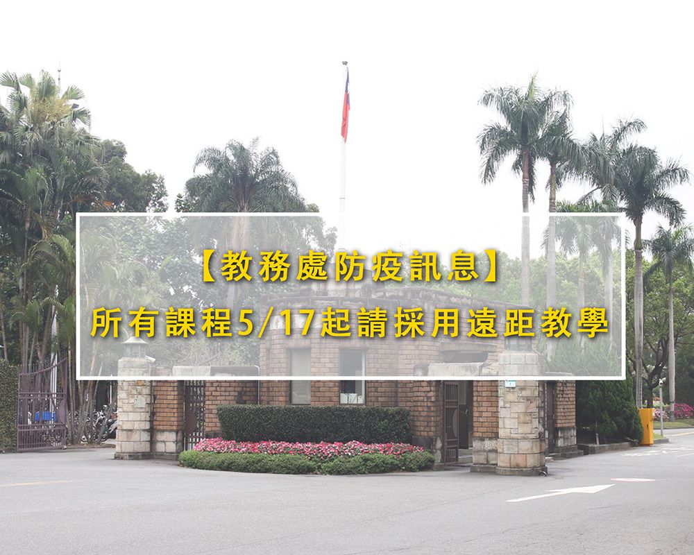 為因應嚴重特殊傳染性肺炎疫情的發展,本校所有課程 (含實驗/實習/實作課程),自5月17日 (週一) 起全面採用遠距教學,校屬5棟 (共同、普通、新生、博雅及綜合) 教學館教室僅提供原授課教師和助教錄製課程,學生請勿進入,以減少師生到校上課,降低群聚感染的風險,請所有師生包涵並配合辦理。實驗或實作課程若必須到校操作,請老師注意控制到現場的人數至多4人同時在埸操作,務必維持讓學生在操作時有適當的社交距離,也請老師盡量採用數位化方式進行。