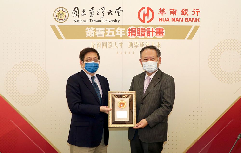 國立臺灣大學管中閔校長與華南商業銀行股份有限公司張雲鵬董事長於5月13日在臺大舉行「華南銀行捐贈臺灣大學獎助學金簽約儀式」,簽署五年捐贈合約,管中閔校長代表校方致贈獎牌,感謝華南銀行對臺大學子的貢獻。