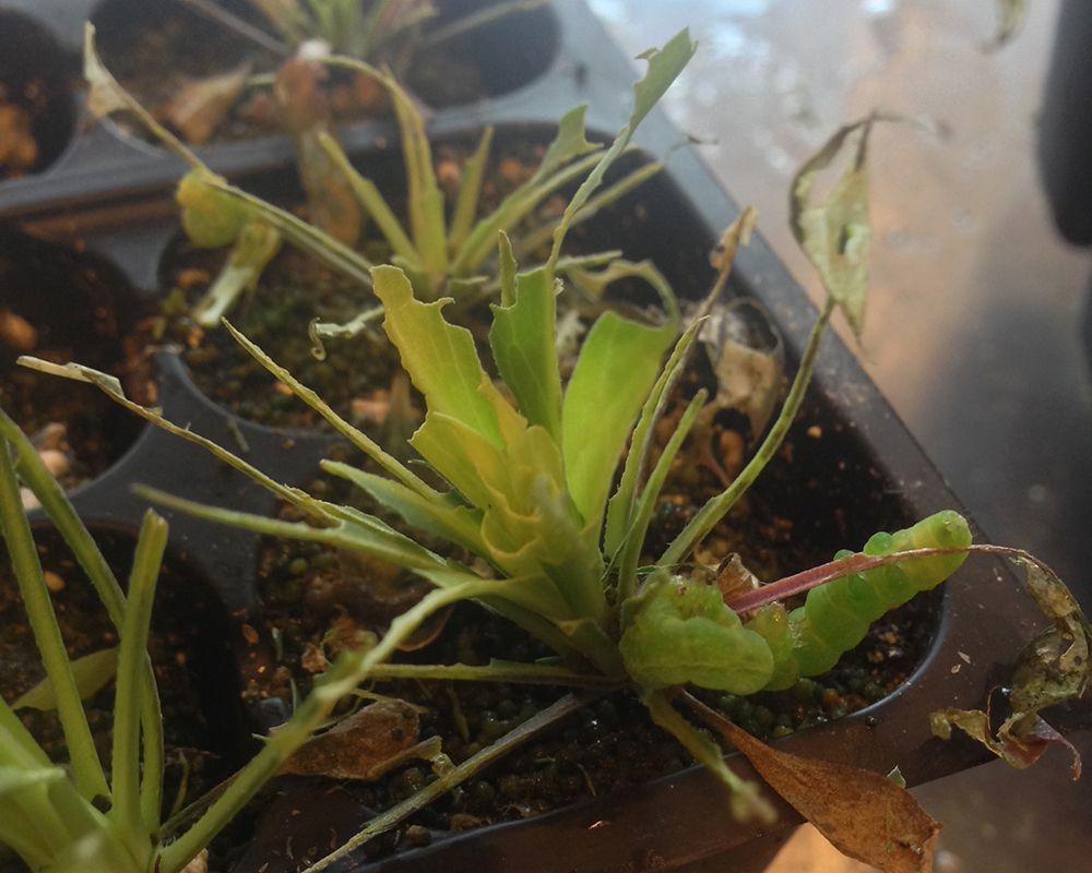 實驗室中受到昆蟲啃食的植株,你能找到毛毛蟲嗎?圖片提供:Lauren Carley。