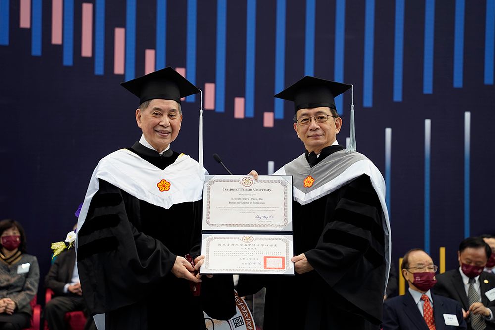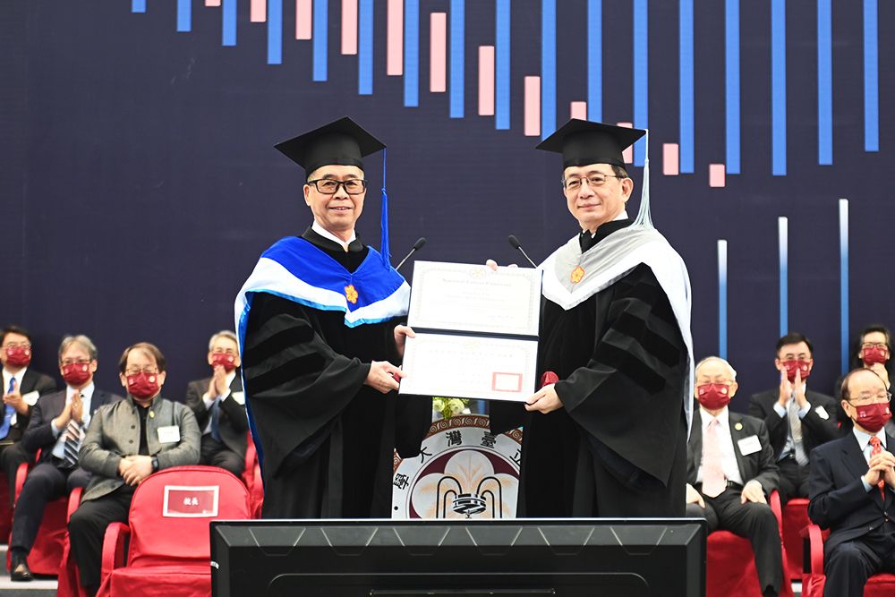 臺大校長管中閔(右)致贈名譽博士學位給聯發科董事長蔡明介(左),以表彰其卓越的成就與貢獻。