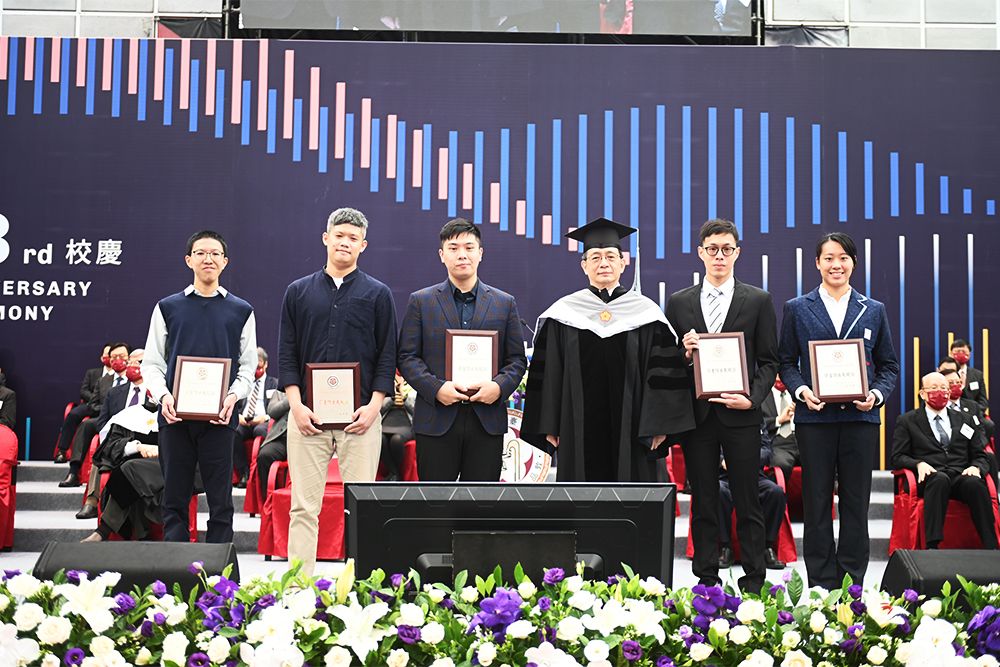 在頒發各式學生獎項部分,本校今年頒發「學生社會奉獻特別獎」予關懷社會、發揮利他精神的生物機電工程學系唐偉倫同學、政治學系林語萱同學,以及臺大自閉星雨服務團;頒發臺大優秀青年、傑出表現獎學金,獎勵臺大學子優良的品德與各項優異學習成果;頒發傅鐘獎學金,以鼓勵高中優秀學子進入臺大就讀。