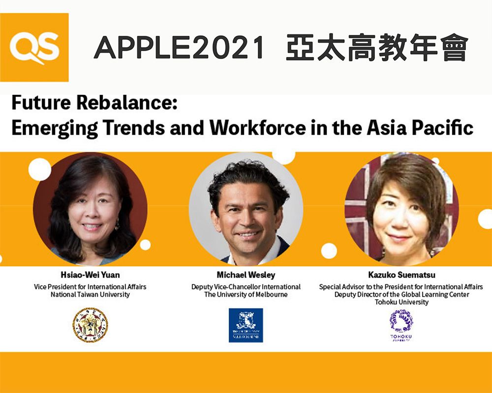 QS亞太高教線上年會於11月3日舉行,主題為Future Rebalance: Emerging Trends and Workforce in the Asia Pacific,與會代表來自世界各地大學校院,包括來自美國哈佛大學、英國倫敦帝國學院、日本京都大學等,對於跨領域研究創新、國際夥伴合作、創新教學、國際學生流動等高教議題進行交流。