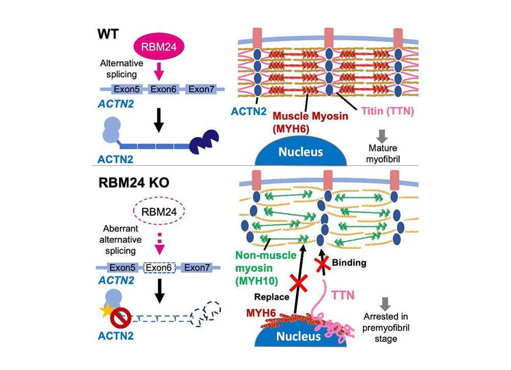 研究團隊發現RBM24在心肌分化過程中,於不同時期階段性調控眾多肌節相關蛋白,可以視為一個心肌發育的主調控者(master regulator)。其中,她們發現形成肌節最主要的核心肌原纖維生成蛋白 (例如ACTN2、TTN和MYH10) 被錯誤拼接。因此,MYH6不能正常替換非肌肉肌球蛋白MYH10,導致肌原纖維在早期前肌原纖維階段停滯並導致肌節中斷。有趣的是,他們發現Z線錨定蛋白ACTN2的肌動蛋白結合域 (ABD;由外顯子6編碼) 主要在心臟早期分化時被排除 (exon exclusion) 在外,而它最終會被包含(exon inclusion)在成人心臟中。最後他們證明RBM24在心臟分化早期的肌節形成中參與重要的功能,其缺失將使ACTN2的外顯子6 (Exon6)被排除(exon exclusion)。他們同時發現RBM24所調控的肌節蛋白,當其變異時都與心肌病變密切相關,因此,團隊證實RBM24在心肌發育過程中扮演著重要的調控角色,並且擔任許多心肌病變基因的上游調控者,因此這份研究可望替未來心肌病變提供新的治療策略。此研究成果發表在國際知名心臟領域重要期刊Circulation Research中,由碩班生盧薈安(第一作者)、蘇亮瑜及大學部學生李康正及葉宇晨所完成。
