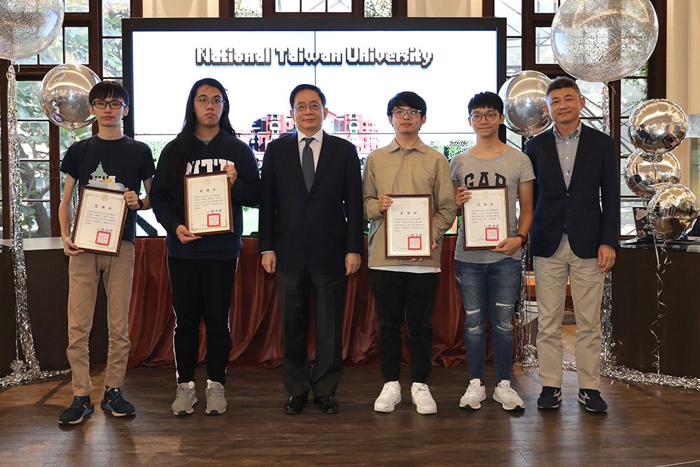 圖左至右分別為資工系學生周奕勳、昆蟲系學生汪經倫、校長管中閔、工科海洋系學生張博皓、資管系學生方譽霖以及副教務長詹魁元。