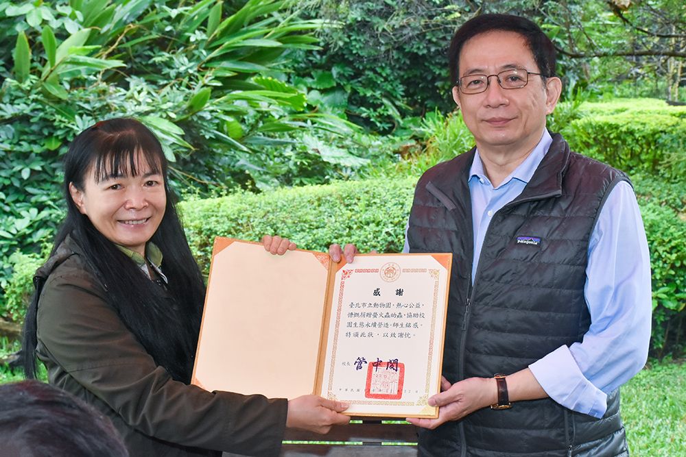 臺大與臺北市立動物園合作校園螢火蟲復育計畫,臺大校方致贈感謝狀給市立動物園,感謝園方捐贈1200隻黃緣螢幼蟲供野放。圖為臺大校長管中閔(右)與臺北市立動物園副園長朱孝芬(左)。
