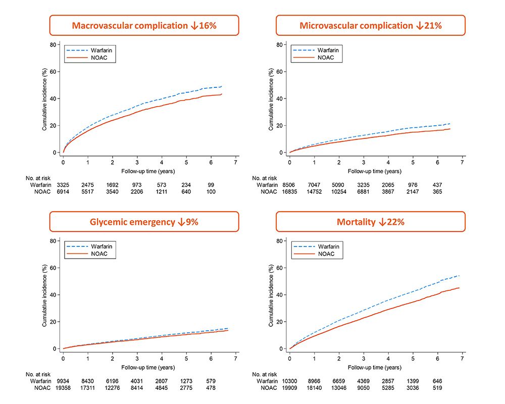 相較於傳統口服抗凝血劑(warfarin),使用新型口服抗凝血劑(NOAC)的病患,發生糖尿病各項併發症和死亡的風險都較低:大血管病變相對風險下降約16%;小血管病變下降約21%;血糖急症下降約9%;死亡風險下降約22%。