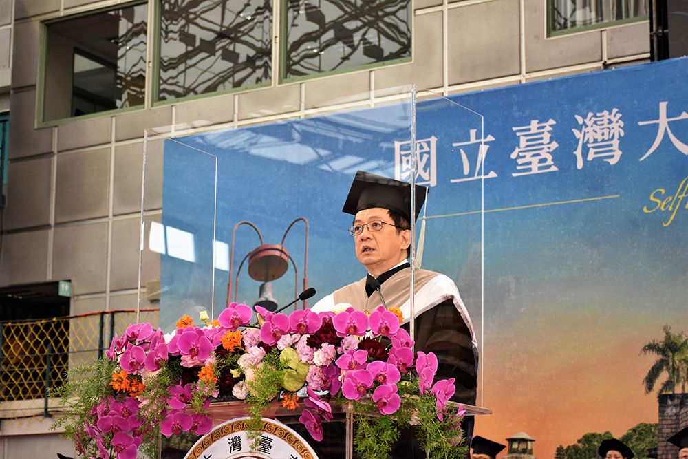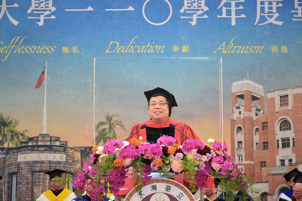 臺大校長管中閔致詞時表示,由於疫情與戰爭,使得此時是個不一樣的年代,值得不一樣的畢業典禮。管校長說,在這個年代,詩歌是一種撫慰,也是一種治療,因此他要為此屆的畢業生朗誦詩歌,分別是作家楊牧《北斗行》的「答舞」一詩,以及美國詩人Walt Whitman「大路之歌」(Song of the Open Road)的首段,祝福畢業生未來在人生的大路上一直向前,堅強而滿足。
