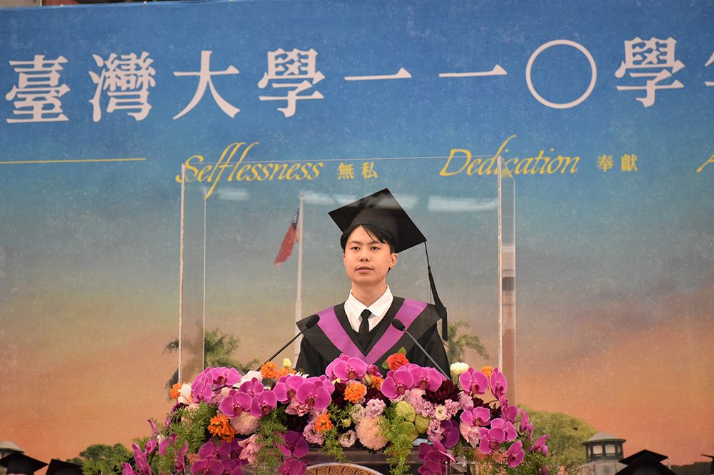在畢業生代表致詞部分,致詞代表之一的政治學系劉崇銘說,由於疫情,今年畢業生是在變動、挫折以及不完美中度過在校園的時光。然而,同學們並沒有被打亂目標,而是將被打亂的人生藍圖變成拼圖,拼湊出獨一無二的生活體驗與人生規劃。在實體、線上交錯的迷茫時代,即使未知的挑戰來臨,同學們依然盡力把生活過成喜歡的樣子,學習承擔責任、學習更彈性的面對挫折以及心中的焦慮。他與同學分享,即使未來會遇到更多變化、更多挫折,同學們都會一起承擔、一起去闖,希望無窮。
