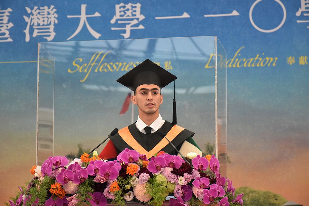 國際生畢業代表–化工系陳功力(Rolando Ruiz Becerri)來自墨西哥,五年前來到臺大唸書,離開自己習慣的生活方式。剛開始到臺灣後不論是生活適應或攻讀學業都有很大壓力。不過他說,這就像系上教授說,鑽石要經過高溫高壓才會成形,他相信這些壓力讓畢業生們都成為鑽石。陳功力在臺大念書時燃起對科學的熱情,創立叫「Pulche Podcast」的YouTube頻道,希望讓更多人愛上科學。陳功力感謝臺大,不只培育國際生成為專業人士,同時也成為連接不同文化間的橋樑,更進一步讓國際生成為世界公民。未來,他希望能貢獻所學投入永續能源的發展,也以家鄉Temoaya諺語「困難的時代可讓我折腰,但一定不能讓我屈服。」(Me doblo, pero no me quiebro.)與所有同學共勉。