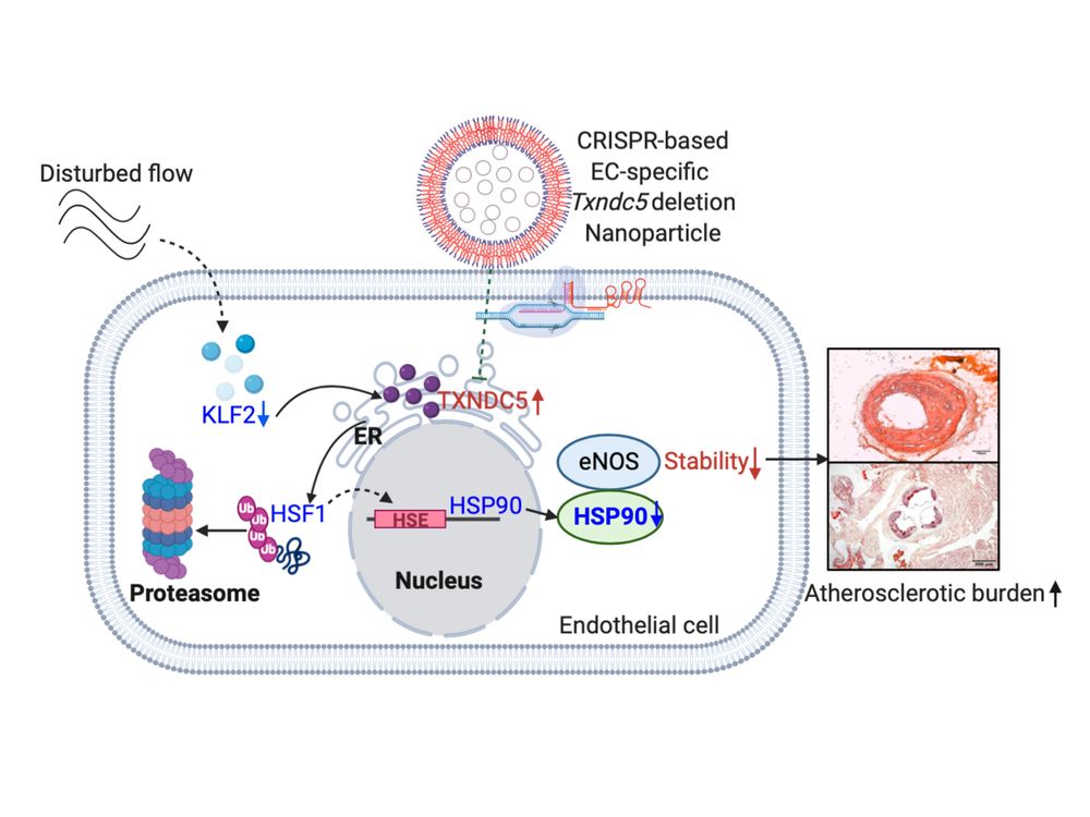 內質網蛋白TXNDC5是一種蛋白質雙硫異構酶(protein disulfide isomerase,PDI),主要位於細胞的內質網,其功能被認為和催化蛋白摺疊以及參與細胞內氧化還原反應有關。近幾年,楊老師研究團隊研究發現TXNDC5在心臟 (Shih et al, Circulation Research 2018)、肺臟 (Lee et al, Nature Communications 2020)、腎臟(Chen et al, Journal of Clinical Investigation 2021)及肝臟(Hong et al, Gut 2021)纖維化具有不可或缺角色。特別的是,TXNDC5的表現在內皮細胞的表現更為顯著,博士班學生葉志凡醫師進一步發現TXNDC5在血液擾流誘導的內皮細胞功能失調及動脈粥狀硬化形成扮演重要的角色。TXNDC5主要是破壞內皮細胞中endothelial Nitric Oxide Synthase (eNOS)蛋白的穩定性,導致內皮功能的異常,進而造成動脈粥狀硬化的發生。研究團隊在人類及小鼠的動脈粥狀硬化病灶中,發現TXNDC5蛋白表現量較健康動脈組織有顯著上升,為證明TXNDC5與動脈硬化生成的因果關係,研究團隊利用多種基因轉殖小鼠與動脈硬化疾病模式,證明TXNDC5高度表達於受擾流刺激下的血管內皮細胞中,並發現特別剔除小鼠內皮細胞中的TXNDC5,可顯著減少動脈粥狀硬化的發生。研究團隊進一步整合奈米微粒及內皮特異性啟動子(CDH5)驅動的CRISPR/Cas9系統,證明標靶性剔除內皮細胞中的TXNDC5可顯著增加eNOS蛋白的表現並減少ApoE-/-小鼠動脈粥狀硬化的發生,驗證TXNDC5是可作為治療動脈粥狀硬化的標的。