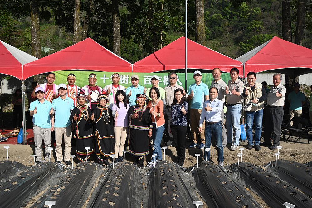 小米春播活動-本校周家蓓副校長、實驗林管理處蔡明哲處長、玉山金控創辦人黃永仁與黃男州董事長與當地原住民合影